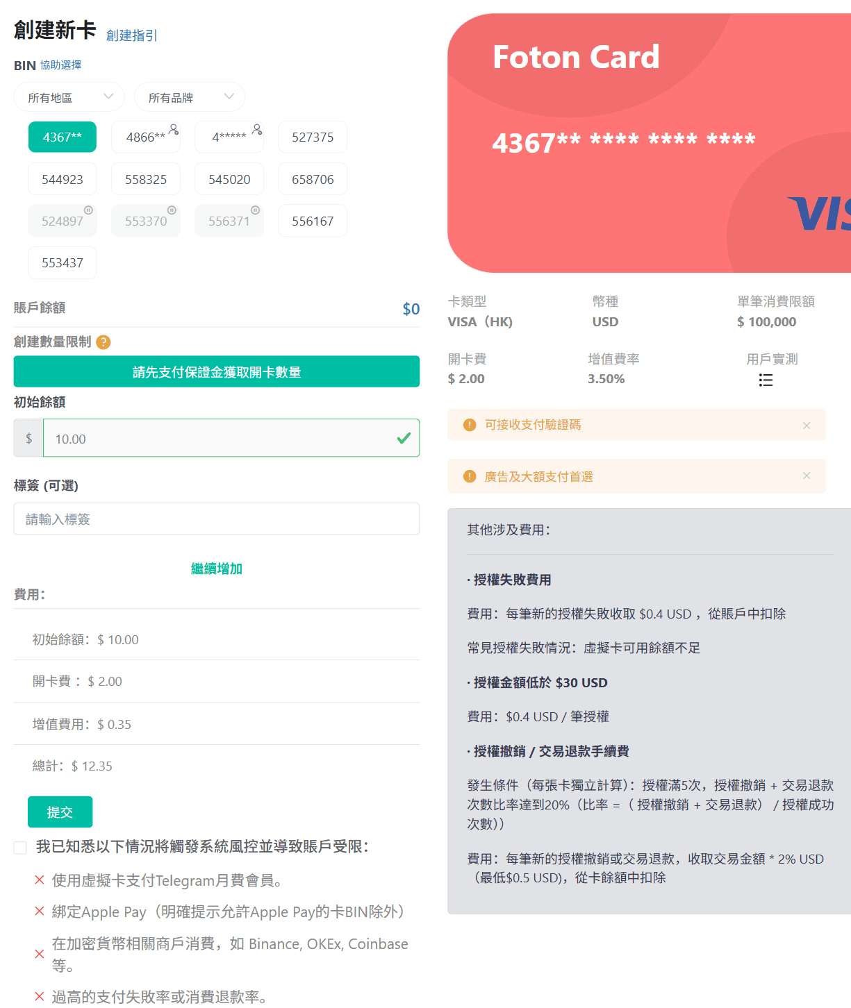平台支持 USDT 充值,部分卡段免实名极速开卡,无视 AVS,支持 3DS 校验,通过率较高。