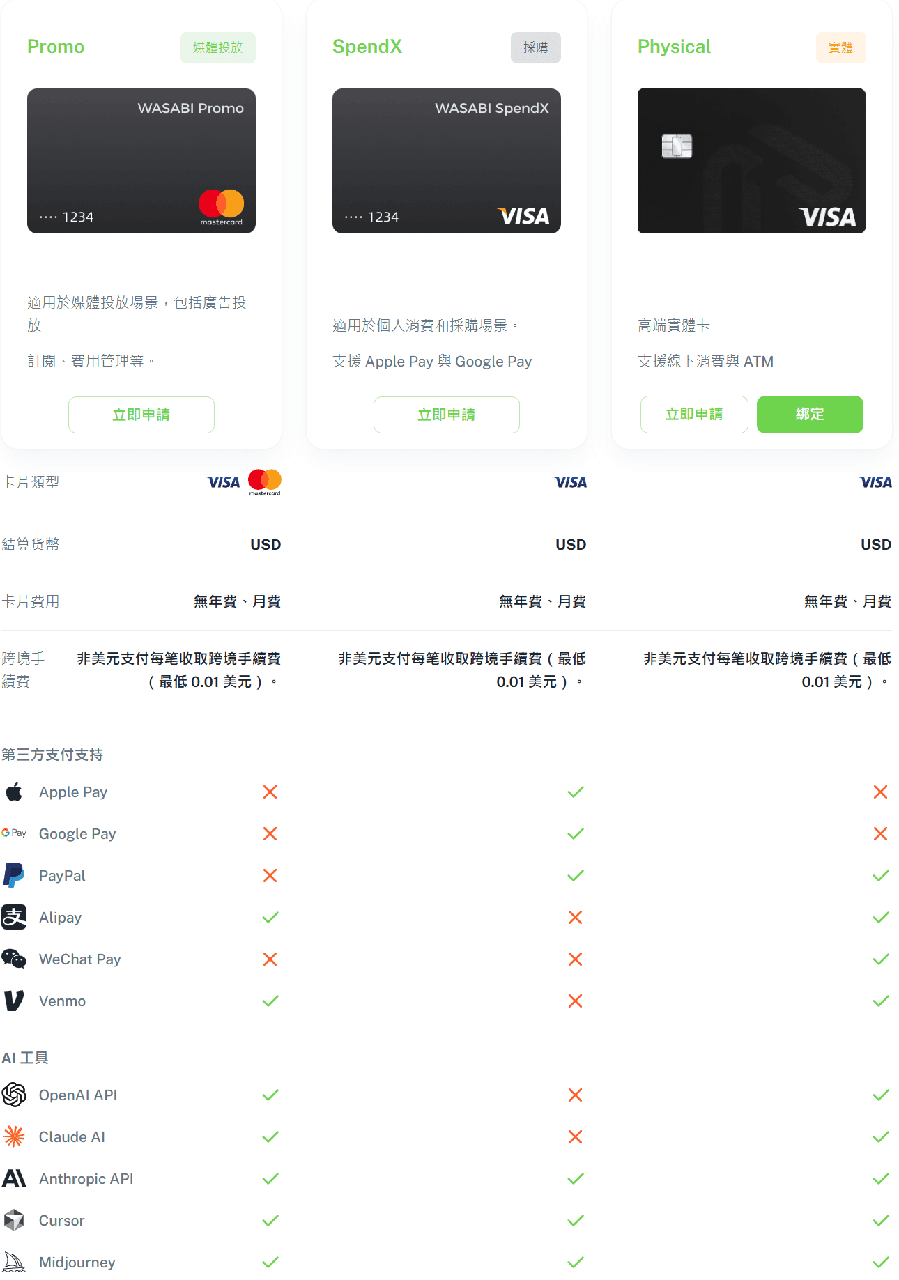 - USDT / 加密用户:选支持加密货币充值的平台(wasabicard),注意充值手续费和到账速度。